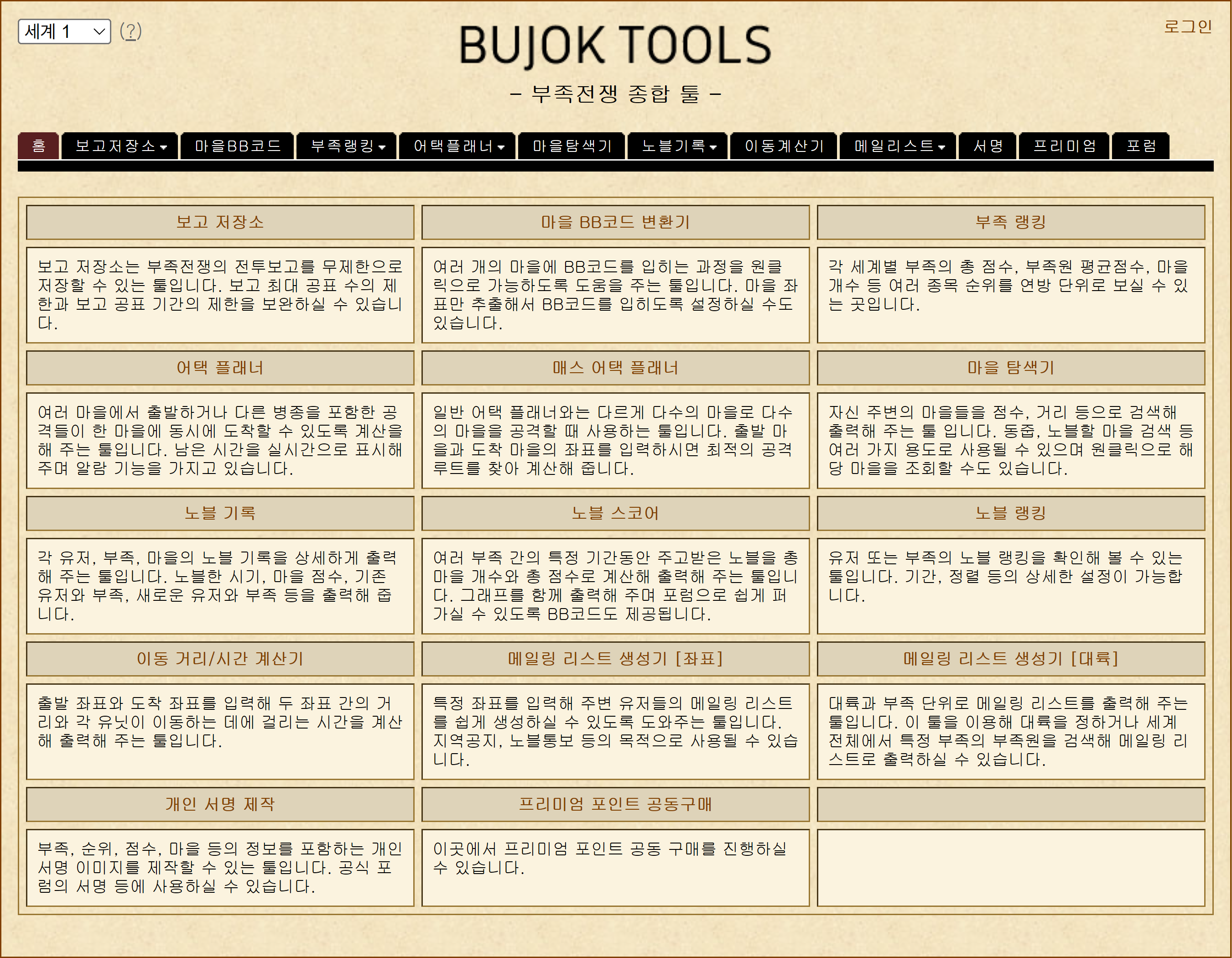 부족 툴즈는 대략 2009년에서 2012년 정도까지 x불멸x이 개발 및 운영했었던 한국 부족전쟁 전용 종합 툴 웹사이트였습니다.